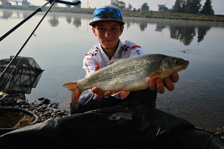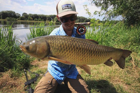 Po kratším relaxu, kdy mi ryby daly přes děličku docela do těla, znovu nahazuji. Chvíli se nic neděje, ale pak začíná splávek pomalu potápět a jede směrem od břehu. Sekám a říkám si super další jeseter. Ale po chvíli se mi zdá, že tahle ryba tahá trochu jinak než všechny předešlé. Občas má nečekané výpady, ne jak velký tah co měli jeseteři. A taky že jo, po chvíli se ve vodě blýskne zlaté tělo. Po chvíli do podběráku dostávám krásně stavěného kapříka. Měří něco málo přes 50 cm. Po chvíli ho pouštím zpět.